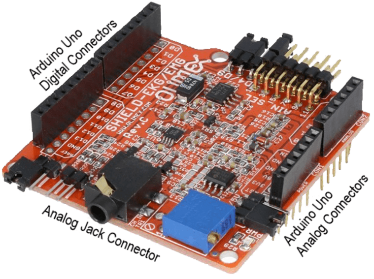 This example uses the Shield-EKG-EMG from Olimex as the extension board. This board is designed, with specific amplifiers and filters, to measure biosignals such as electrocardiogram (ECG) and electromyogram (EMG).