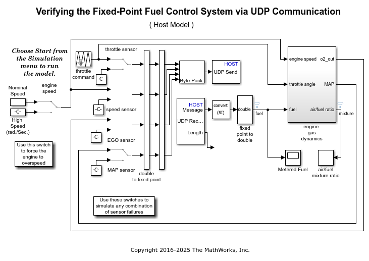 In this task, you will run the Model Fault-Tolerant Fuel Control System example on the STM32F746G Discovery Board. The control algorithm runs on the target while the host runs a plant simulation of the system. The target and the host communicate via UDP. The target model receives the fuel system control sensors values from the host model and transmits back the calculated fuel mixture ratio to the host computer.