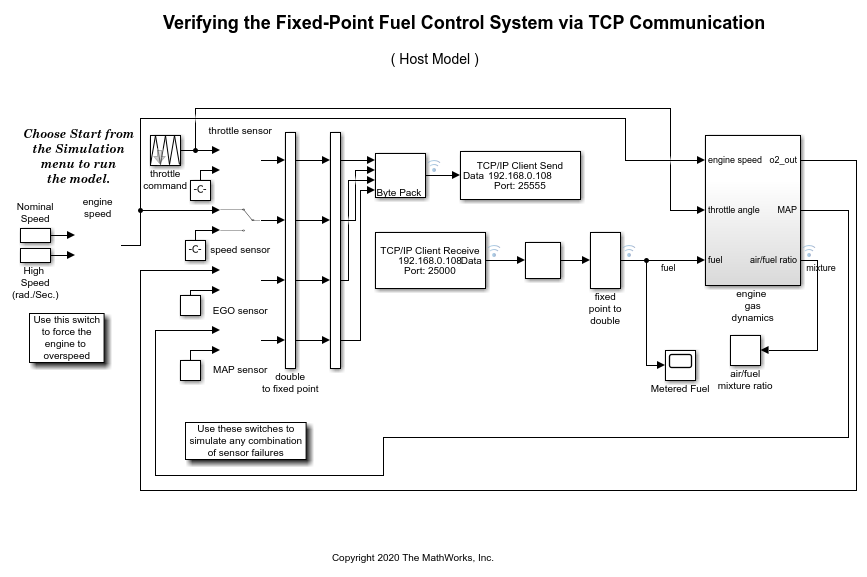 In this task, you will run the Model Fault-Tolerant Fuel Control System example on the STM32L475VG Discovery (B-L475E-IOT01A) board. The control algorithm runs on the target (STM32L475VG Discovery (B-L475E-IOT01A) board) while the host runs a plant simulation of the system. The target and the host models communicate via TCP. The target model receives the fuel system control sensor values from the host model and transmits the calculated fuel mixture ratio to the host computer.