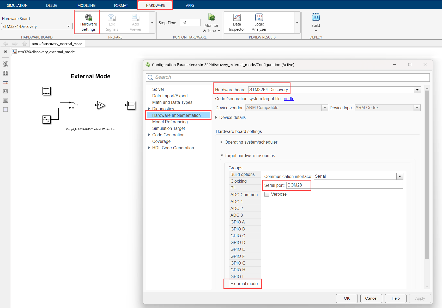 In this task, you will run the stm32f4discovery_external_mode model in External mode. When you are prototyping and developing algorithms, it is useful to monitor signals and tune parameters while the algorithms are running on the hardware. The Simulink External mode feature enables this capability.