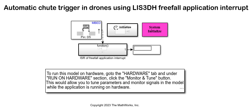 This example shows how to use the STM32® Microcontroller Blockset to sense the free-fall of the sensor using the Inertial freefall application interrupt of LIS3DH linear accelerometer connected to a STMicroelectronics Nucleo board.