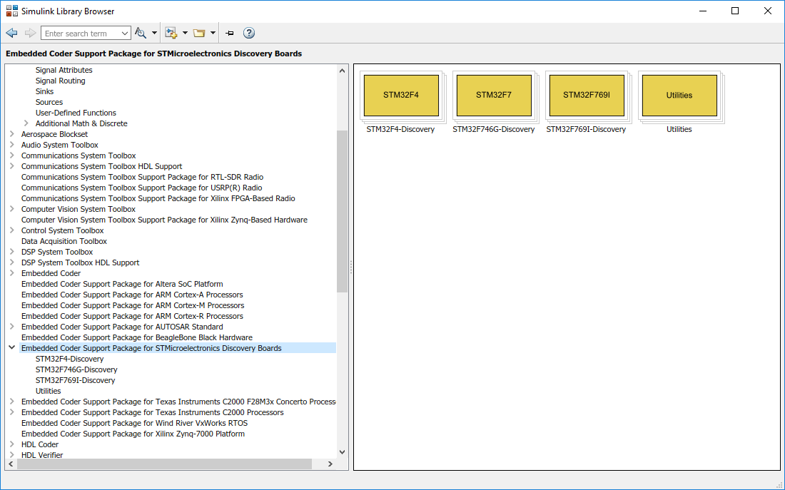 Similarly, click the other STMicroelectronics® Discovery boards to open its corresponding block library.