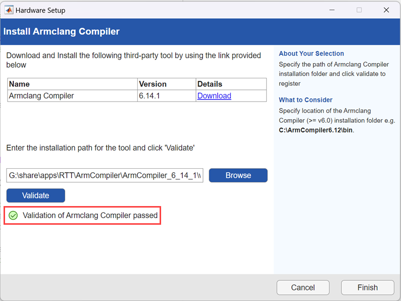 6. Click Finish, if the validation of Armclang compiler is successful.