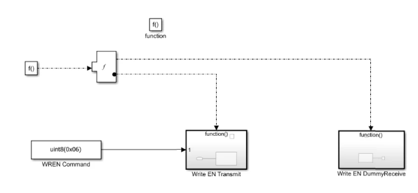 The write operation uses three function-call subsystems: Write Enable, Write Data, and Wait for Write Cycle.