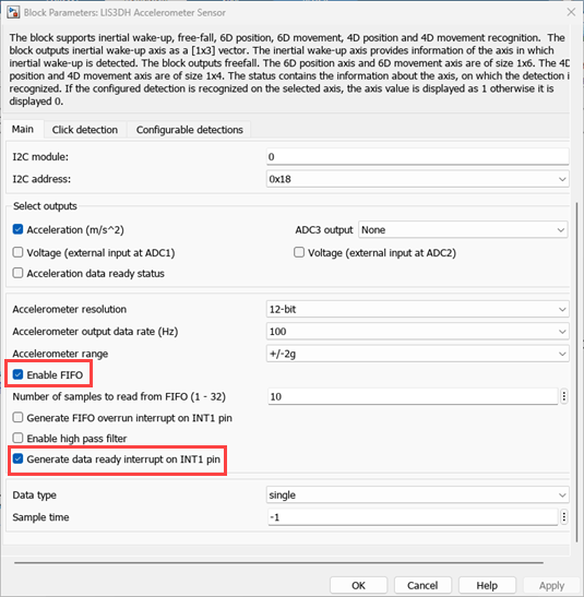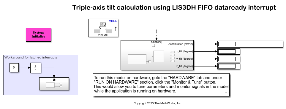 This example shows how to use the FIFO data ready interrupt of LIS3DH linear accelerometer connected to a STMicroelectronics® Nucleo board to sense the tilt of the sensor. This is done using a downstream function-call subsystem that reads acceleration values from FIFO buffer sensor.