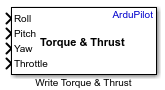 The Write Torque & Thrust block writes the normalized torque (roll, pitch, yaw) and thrust (throttle) commands to the ArduPilot Mixer.