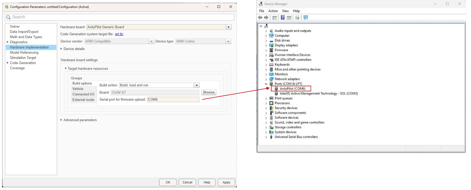 When working with ArduPilot firmware and Simulink models, it is important to correctly configure the COM ports for both firmware upload and MAVLink communication. This is especially relevant for hardware such as the CUAV-X7, where the bootloader and main firmware operate on different COM ports.