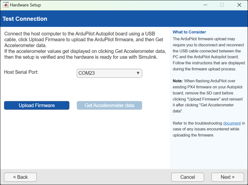 This screen is displayed only if you select an ArduPilot hardware board, rather than the ArduPilot Host Target, in the Select an ArduPilot board screen.