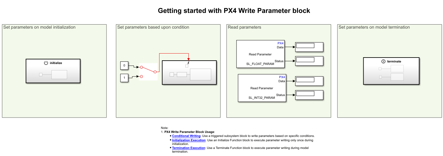 Initialization Execution: To execute parameter writing only once during initialization, use an Initialize Function block. This block ensures that the parameter writing occurs at the start of the model execution.