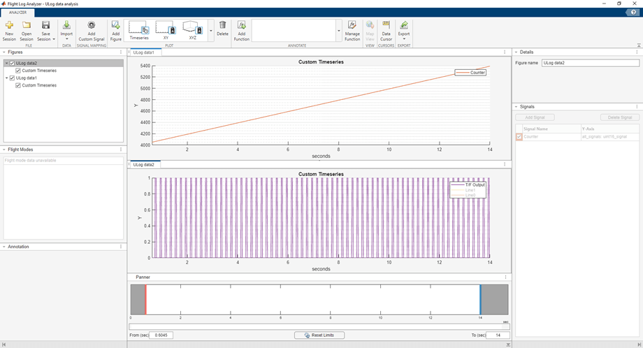 You can analyze the downloaded signals in MATLAB by using ulogreader, which enables you to import the data into workspace for further analysis. You can also use the Flight Log Analyzer to plot the data directly from ULog file as shown below.