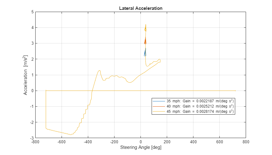 The results are similar to these plots, which indicate that the greatest lateral acceleration occurs when the vehicle velocity is 45 mph.