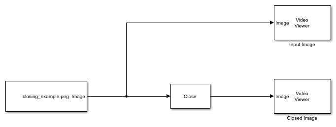 The model reads an input binary image by using the Image From File block. The Closing block performs the closing operation on the input image. The model uses a disk-shaped structuring element with a radius of 4. The model displays the output image by using the Video Viewer block.