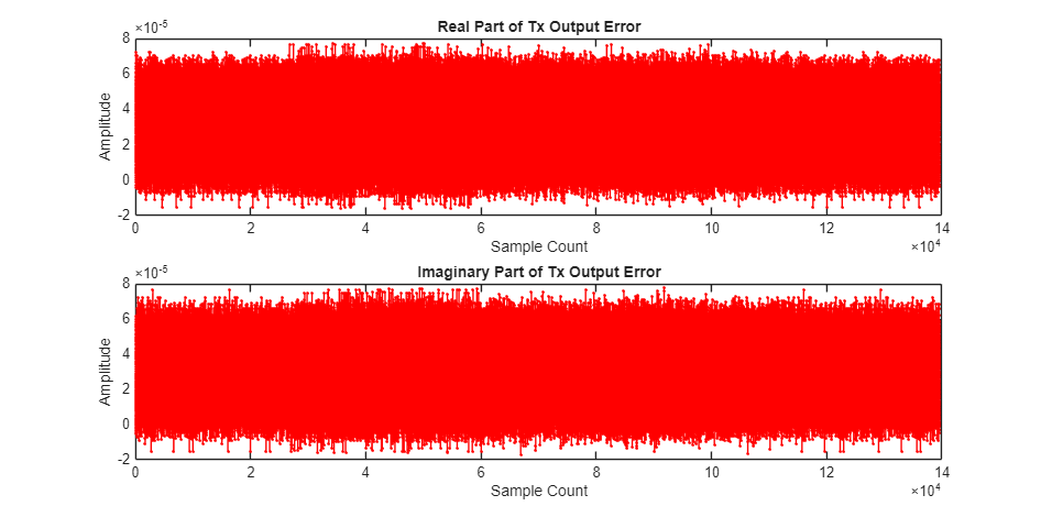 Run the model to display the transmitter spectrum, error plot between the reference waveform and simulation output, and relative mean squared error of the simulation output.