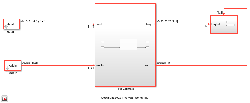 Running the model imports the input signal variables to the model and exports freqEst and a control signal validOut to the MATLAB® workspace.