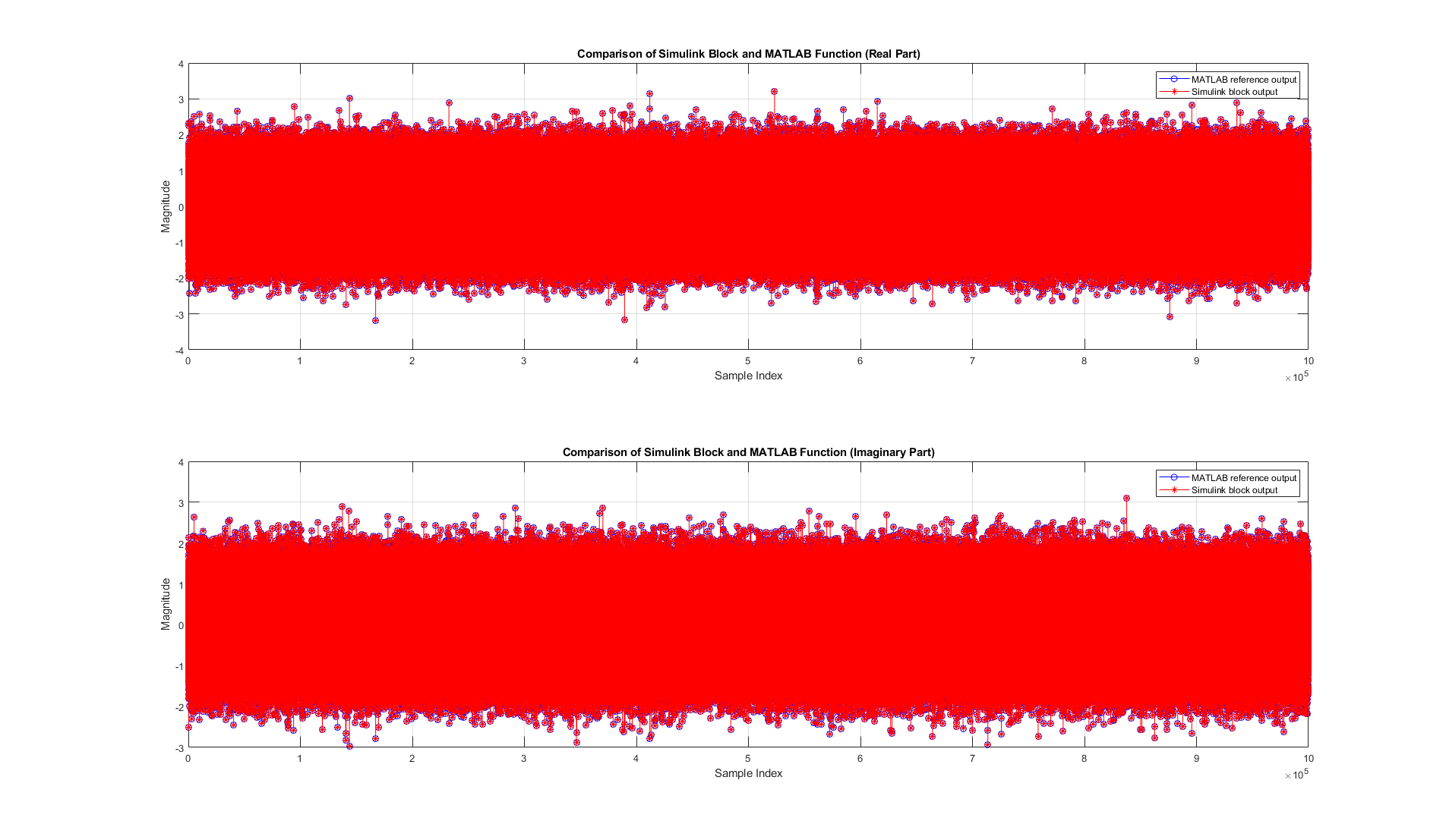 % MATLAB output fprintf('\n Simulating MATLAB HDL Fading for comparison...\n'); fadedComplxSymMatlab = hdlFadingChan(dataInSym,discretePathDelays,avgPathGainsdB,normAvgPowTo0dB,fadingDistri,KFactor); fprintf('\n Simulation complete. \n') % Compare MATLAB and Simulink outputs figure('units','normalized','outerposition',[0 0 1 1]) subplot(2,1,1) plot(real(fadedComplxSymMatlab(:)),'-bo'); hold on; plot(real(fadedComplxSym(:)),'-r*'); grid on legend('MATLAB reference output','Simulink block output') xlabel('Sample Index') ylabel('Magnitude') title('Comparison of Simulink Block and MATLAB Function (Real Part)') subplot(2,1,2) plot(imag(fadedComplxSymMatlab(:)),'-bo'); hold on; plot(imag(fadedComplxSym(:)),'-r*'); grid on legend('MATLAB reference output','Simulink block output') xlabel('Sample Index') ylabel('Magnitude') title('Comparison of Simulink Block and MATLAB Function (Imaginary Part)') sqnrRealdB = 10*log10(double(var(real(fadedComplxSym(:)))/abs(var(real(fadedComplxSym(:)))-var(real(fadedComplxSymMatlab(:)))))); sqnrImagdB = 10*log10(double(var(imag(fadedComplxSym(:)))/abs(var(imag(fadedComplxSym(:)))-var(imag(fadedComplxSymMatlab(:)))))); fprintf('\n HDL Fading Channel output \n SQNR of real part: %.2f dB',sqnrRealdB); fprintf('\n SQNR of imaginary part: %.2f dB\n',sqnrImagdB);