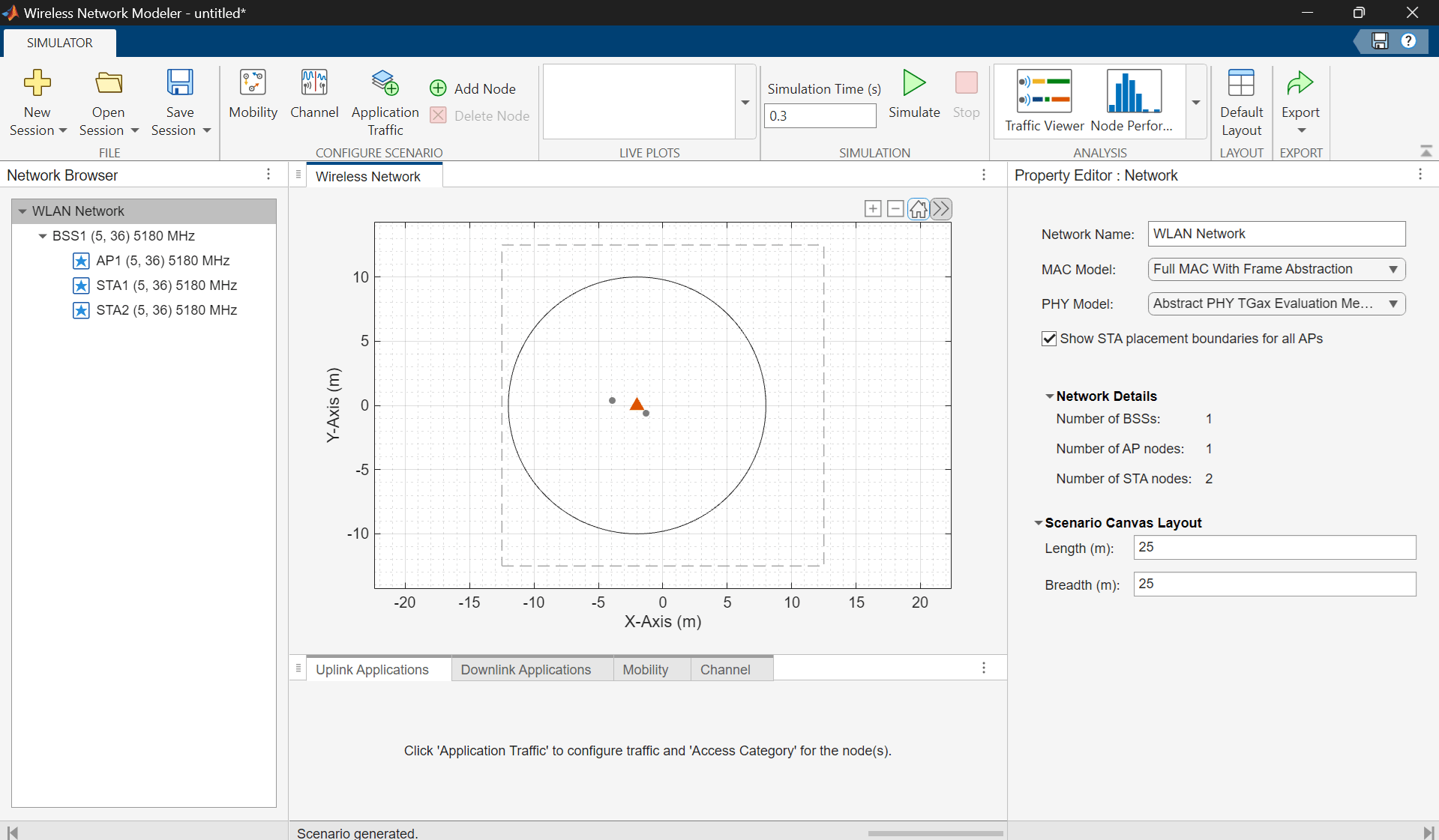 Model a wireless local area network (WLAN), consisting of an access point (AP) and two stations (STAs), using the Wireless Network Modeler app.