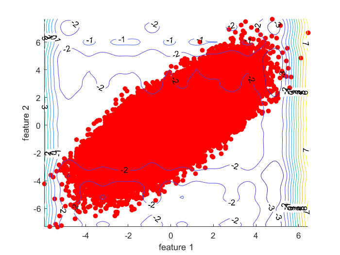 Hi all, I have to train a one class SVM for anomaly detection. I have a dataset with two features. I trained the model on normal instances with ocsvm function. What I don't understand are the contour lines for the ocsvm scores... I do not expect those to be like that. In the figure are represented the normal instances in the space (feature1, feature2) and the contour lines corresponding to some values of ocsvm score. They are simply absurd, not like the example see on the matlab guide. I would expect ellipsoidal contour lines, not these! Any help? Thank you!