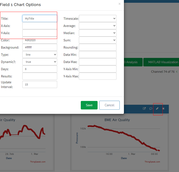 Time DescendingCan you clarify what you mean by tag? There are channel level tags, but I am not clear what you mean by the 'fields you have configured in the channel number'. You can change the Title and axis titles in the chart parameters dialog. Click on the pencil icon on your chart to edit these properties.