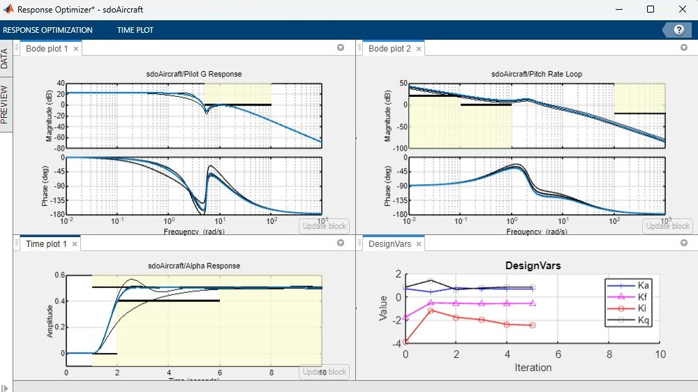 To improve system design characteristics such as response time, bandwidth, and energy consumption, you can jointly optimize physical plant parameters and algorithmic or controller gains. These parameters can be tuned to meet time-domain and frequency-domain requirements, such as overshoot and phase margin, and custom requirements.